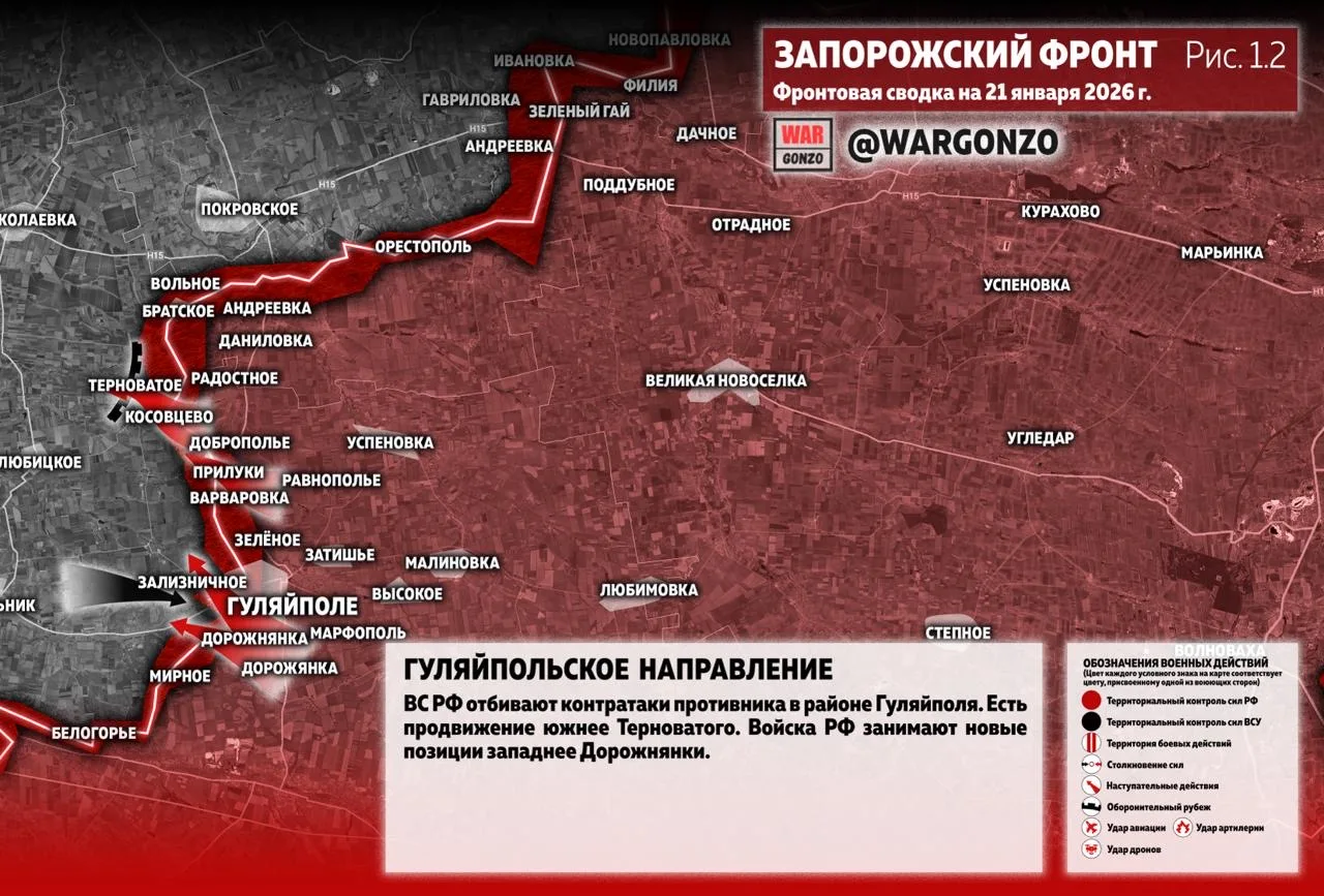 На Гуляйпольском направлении ВС РФ отбивают контратаки противника в районе Гуляйполя. Есть продвижение южнее Терноватого. Войска РФ занимают новые позиции западнее Дорожнянки. (Рис. 1.2)