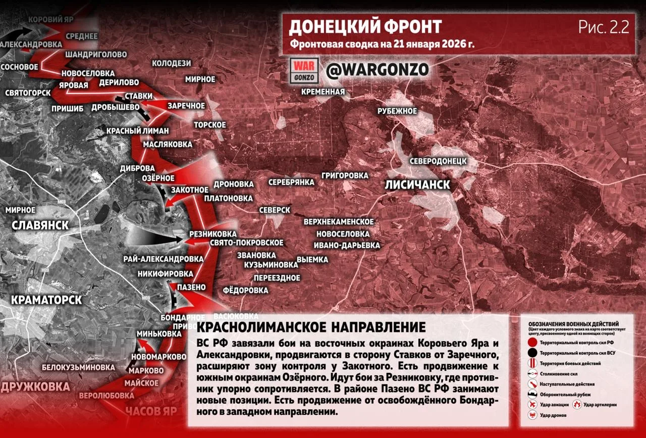 На Краснолиманском направлении ВС РФ завязали бои на восточных окраинах Коровьего Яра и Александровки, продвигаются в сторону Ставков от Заречного, расширяют зону контроля у Закотного. Есть продвижение к южным окраинам Озёрного. Идут бои за Резниковку, где противник упорно сопротивляется. В районе Пазено ВС РФ занимают новые позиции. Есть продвижение от освобождённого Бондарного в западном направлении. (Рис. 2.2)