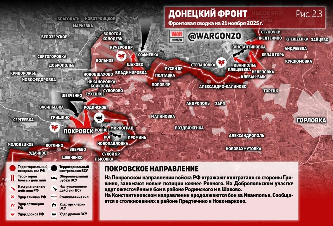 На Покровском направлении войска РФ отражают контратаки со стороны Гришино, занимают новые позиции южнее Ровного. На Добропольском участке идут ожесточённые бои в районе Родинского и в Шахово. (Рис. 2.2)