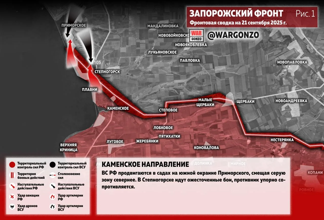 ВС РФ продвигаются в садах на южной окраине Приморского, смещая серую зону севернее. В Степногорске идут ожесточенные бои, противник упорно сопротивляется. (Рис. 1)