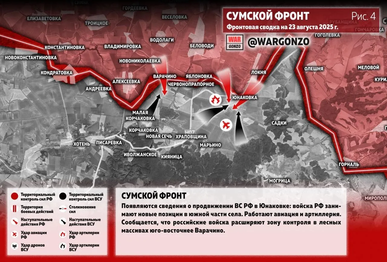 Появляются сведения о продвижении ВС РФ в Юнаковке: войска РФ занимают новые позиции в южной части села. Работают авиация и артиллерия. Сообщается, что российские войска расширяют зону контроля в лесных массивах юго-восточнее Варачино. (Рис. 4)