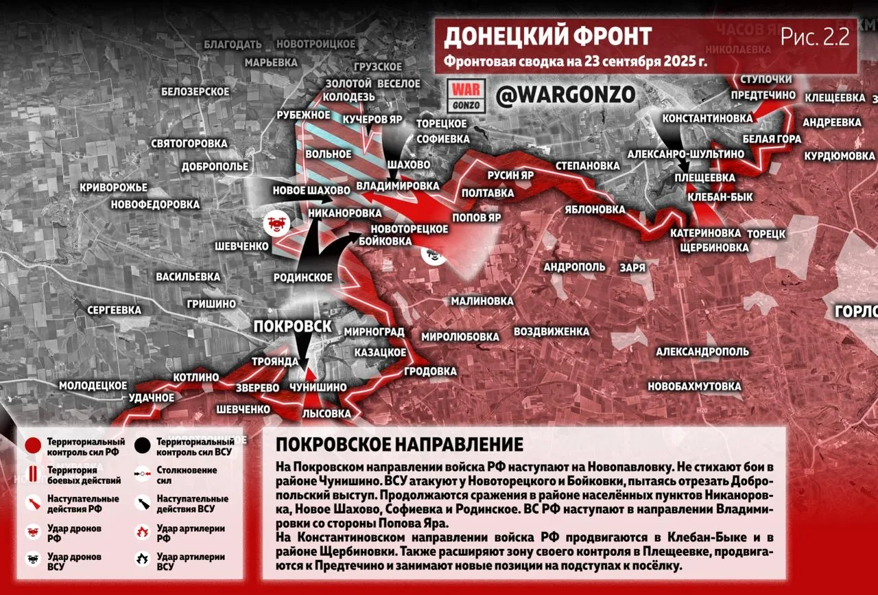 На Покровском направлении войска РФ наступают на Новопавловку. Не стихают бои в районе Чунишино. ВСУ атакуют у Новоторецкого и Бойковки, пытаясь отрезать Добропольский выступ. Продолжаются сражения в районе населённых пунктов Никаноровка, Новое Шахово, Софиевка и Родинское. ВС РФ наступают в направлении Владимировки со стороны Попова Яра. (Рис. 2.2)