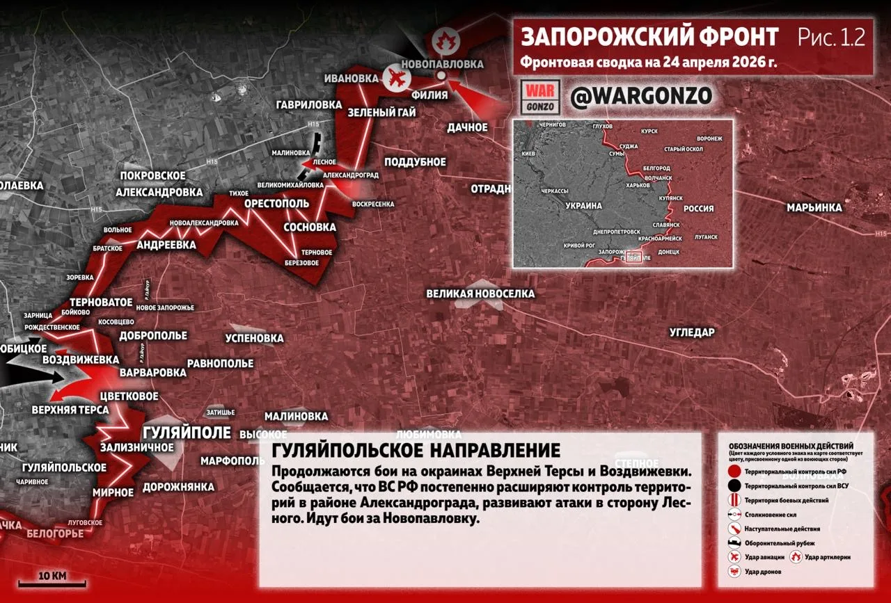 На Гуляйпольском направлении продолжаются бои на окраинах Верхней Терсы и Воздвижевки. Сообщается, что ВС РФ постепенно расширяют контроль территорий в районе Александрограда, развивают атаки в сторону Лесного. Идут бои за Новопавловку. (Рис. 1.2)