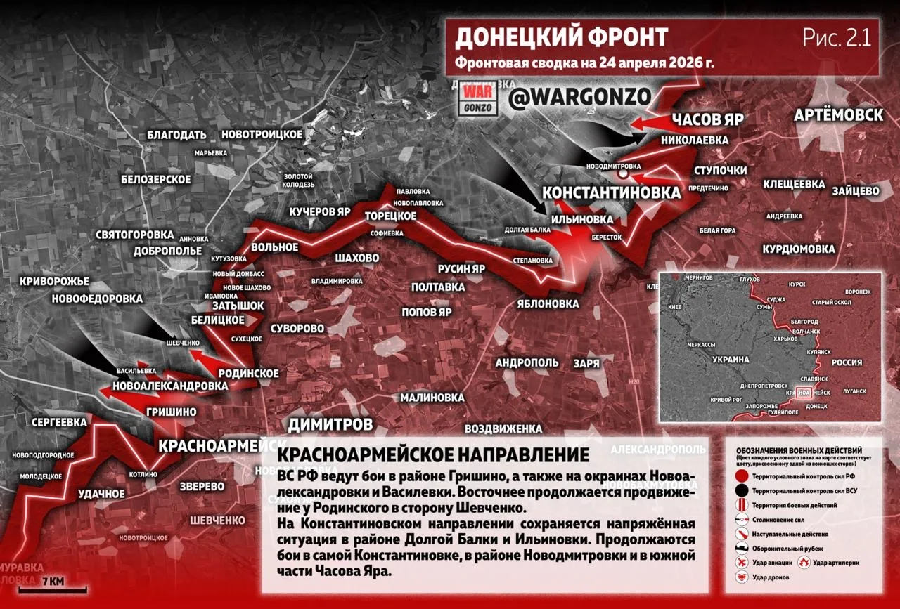 На Константиновском направлении сохраняется напряжённая ситуация в районе Долгой Балки и Ильиновки. Продолжаются бои в самой Константиновке, в районе Новодмитровки и в южной части Часова Яра.
