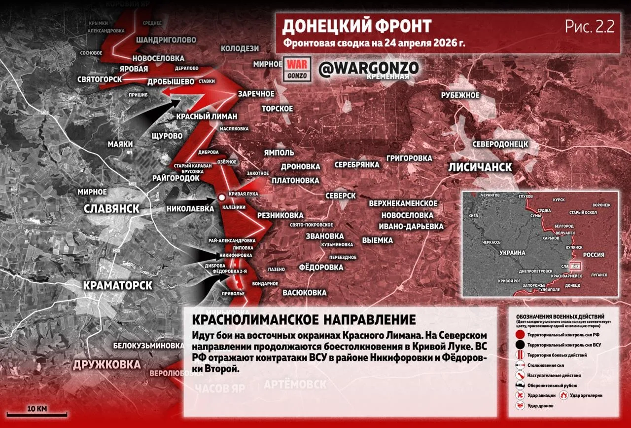 Идут бои на восточных окраинах Красного Лимана. На Северском направлении продолжаются боестолкновения в Кривой Луке. ВС РФ отражают контратаки ВСУ в районе Никифоровки и Фёдоровки Второй. (Рис. 2.2)