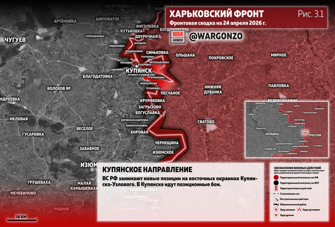 На Купянском направлении ВС РФ занимают новые позиции на восточных окраинах Купянска-Узлового. В Купянске идут позиционные бои. (Рис. 3.1)