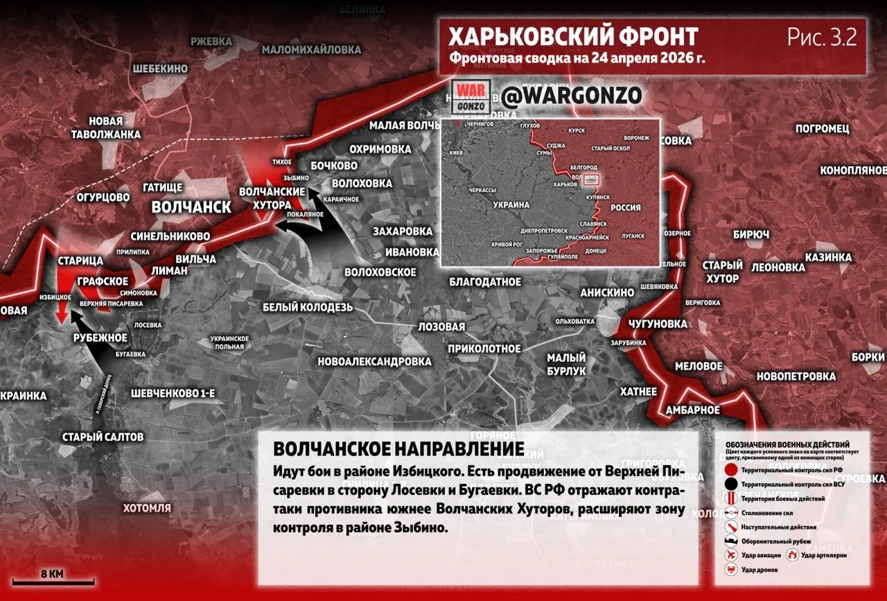 На Волчанском направлении идут бои в районе Избицкого. Есть продвижение от Верхней Писаревки в сторону Лосевки и Бугаевки. ВС РФ отражают контратаки противника южнее Волчанских Хуторов, расширяют зону контроля в районе Зыбино. (Рис. 3.2)