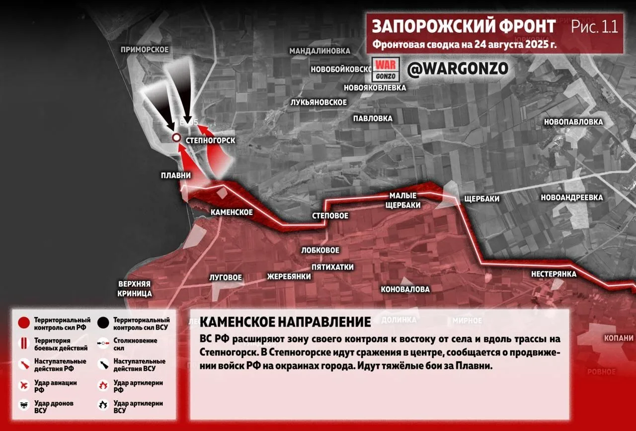 В районе Каменского ВС РФ расширяют зону своего контроля к востоку от села и вдоль трассы на Степногорск. В Степногорске идут сражения в центре, сообщается о продвижении войск РФ на окраинах города. Идут тяжёлые бои за Плавни. (Рис. 1.1)