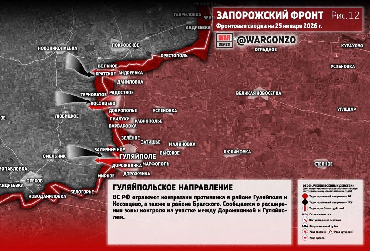 На Гуляйпольском направлении ВС РФ отражают контратаки противника в районе Гуляйполя и Косовцево, а также в районе Братского. Сообщается о расширении зоны контроля на участке между Дорожнянкой и Гуляйполем. (Рис.1.2)