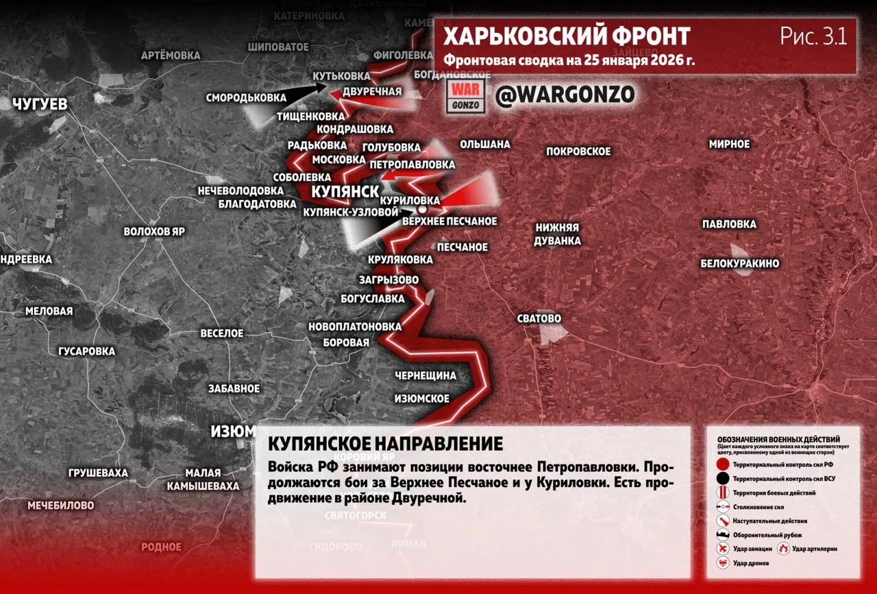 На Купянском направлении войска РФ занимают позиции восточнее Петропавловки. Продолжаются бои за Верхнее Песчаное и у Куриловки. Есть продвижение в районе Двуречной. (Рис.3.1.)