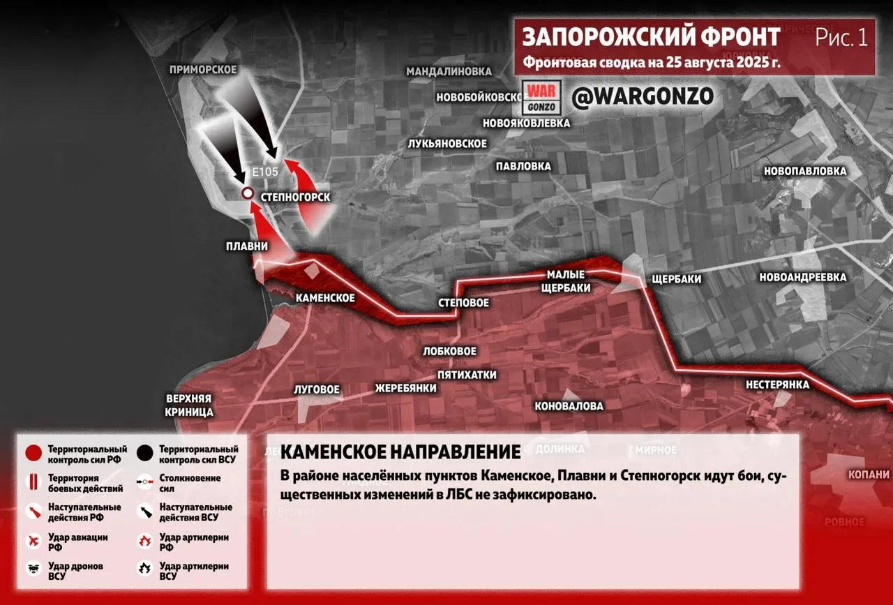 В районе населённых пунктов Каменское, Плавни и Степногорск идут бои, существенных изменений в ЛБС не зафиксировано. (Рис. 1)