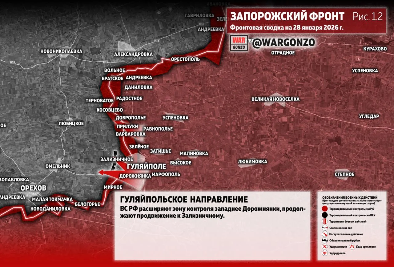 Запорожский фронт Продолжаются бои в районе Магдалиновки и Лукьяновского. Минобороны РФ сообщило об освобождении Новояковлевки. (Рис. 1.1) На Гуляйпольском направлении ВС РФ расширяют зону контроля западнее Дорожнянки, продолжают продвижение к Зализничному. (Рис. 1.2)
