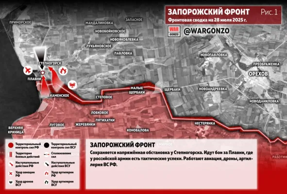 Запорожский фронт. Сохраняется напряжённая обстановка у Степаногорска. Идут бои за Плавни, где у российской армии есть тактические успехи. Работают авиация, дроны, артиллерия ВС РФ. (Рис. 1)