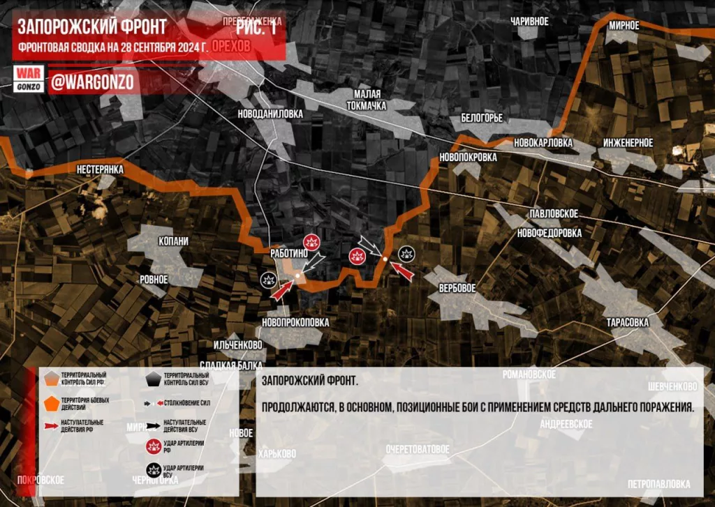 Запорожский фронт. Продолжаются, в основном, позиционные бои с применением средств дальнего поражения. (Рис. 1)