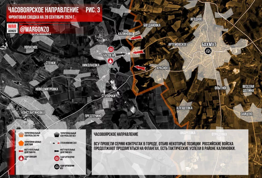 Часовоярское направление. ВСУ провели серию контратак в городе, отлив некоторые позиции. Российские войска продолжают продвигаться на флангах, есть тактические успехи в районе Калиновки. (Рис. 3)