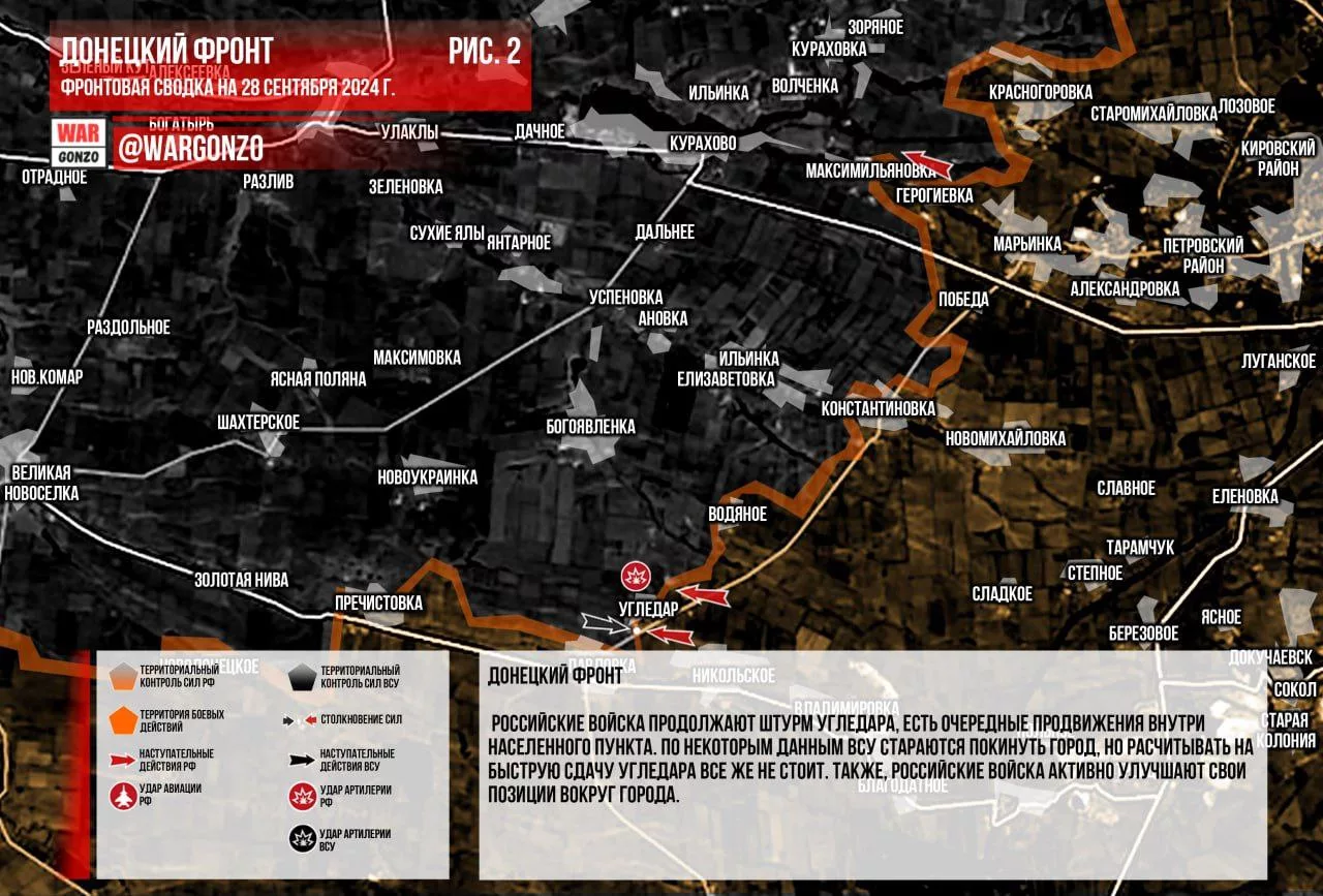 Донецкий фронт. Российские войска продолжают штурм Угледара, есть очередные продвижения внутри населенного пункта. По некоторым данным ВСУ стараются покинуть город, но расчитывать на быструю сдачу Угледара все же не стоит. Также, российские войска активно улучшают свои позиции вокруг города.(Рис. 2)