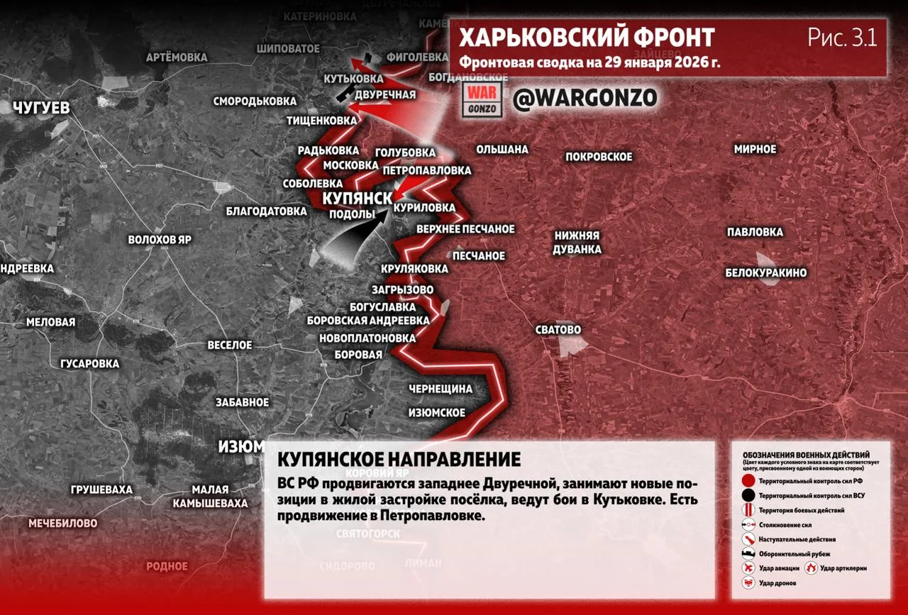 Харьковский фронт На Купянском направлении ВС РФ продвигаются западнее Двуречной, занимают новые позиции в жилой застройке посёлка, ведут бои в Кутьковке. Есть продвижение в Петропавловке. (Рис. 3.1) На Волчанском направлении войска РФ продвигаются в лесах у Старицы, ведут бои в Графском, занимают новые позиции в районе Симоновки. В Волчанских Хуторах продолжаются тяжёлые бои. (Рис. 3.2)