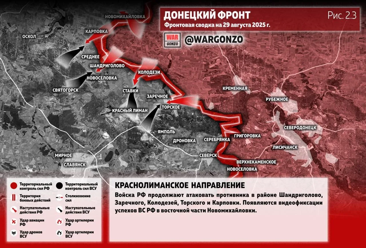 На Краснолиманском направлении войска РФ продолжают атаковать противника в районе Шандриголово, Заречного, Колодезей, Торского и Карповки. Появляются видеофиксации успехов ВС РФ в восточной части Новомихайловки. (Рис. 2.3)