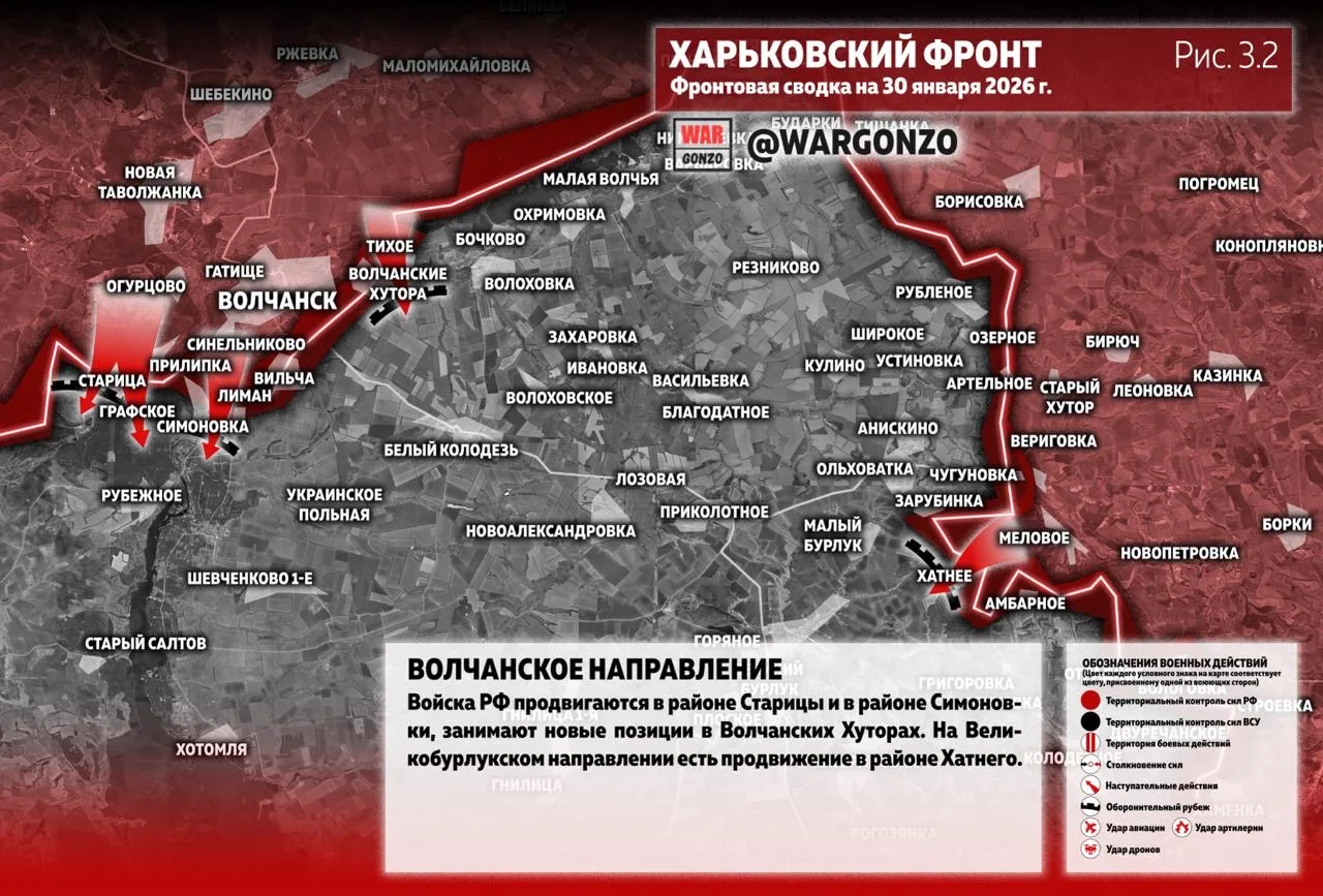 На Волчанском направлении войска РФ продвигаются в районе Старицы и в районе Симоновки, занимают новые позиции в Волчанских Хуторах. На Великобурлукском направлении есть продвижение в районе Хатнего. (Рис. 3.2)