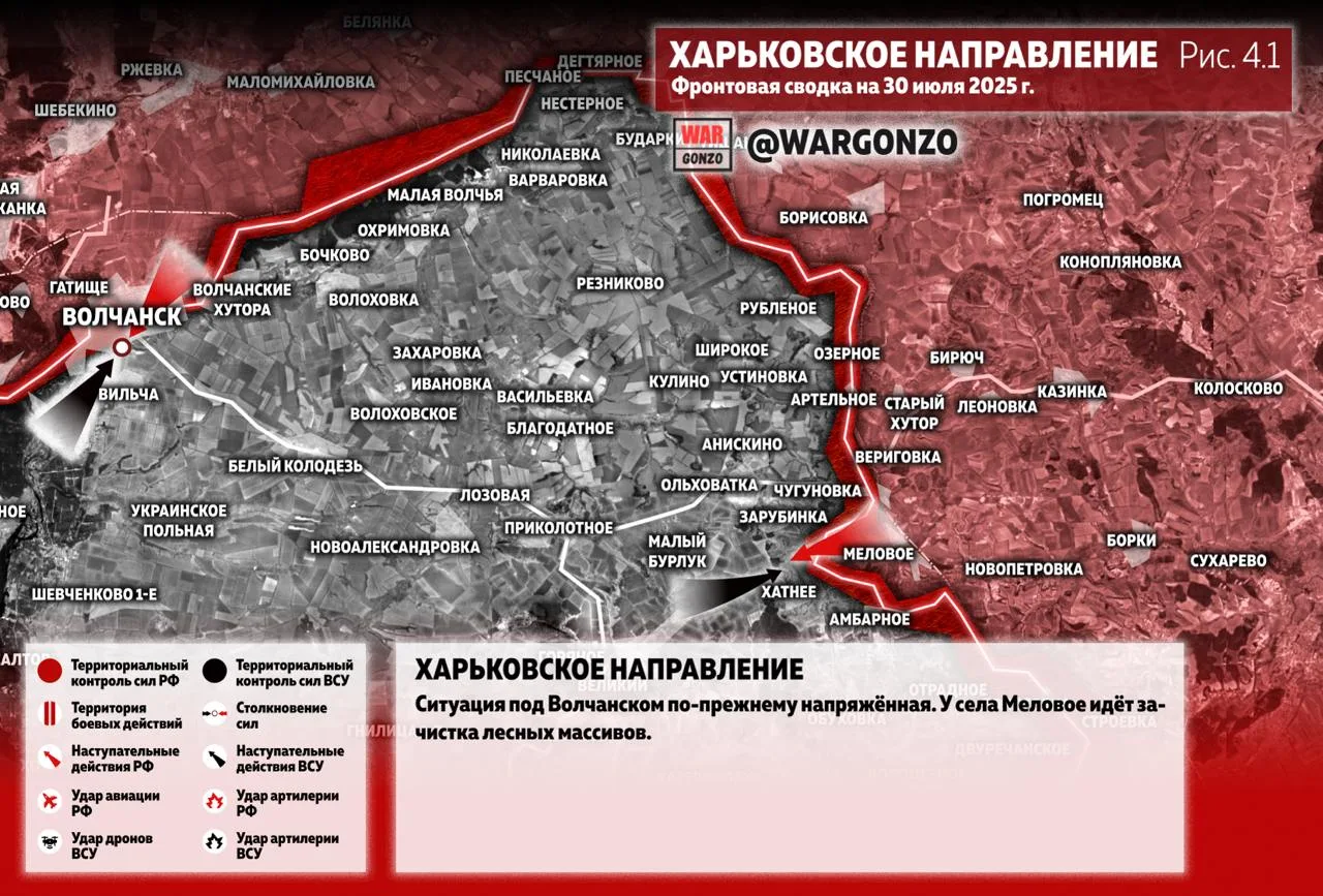 Харьковское направление. Ситуация под Волчанском по-прежнему напряжённая. У села Меловое идёт зачистка лесных массивов. Войска РФ продолжают охват Купянска с севера и северо-запада. Идут бои в районе Московки. Появляется информация о том, что ВС РФ дошли до Соболевки. Сообщается о периодическом проникновении российских ДРГ уже и в сам Купянск. (Рис.4)