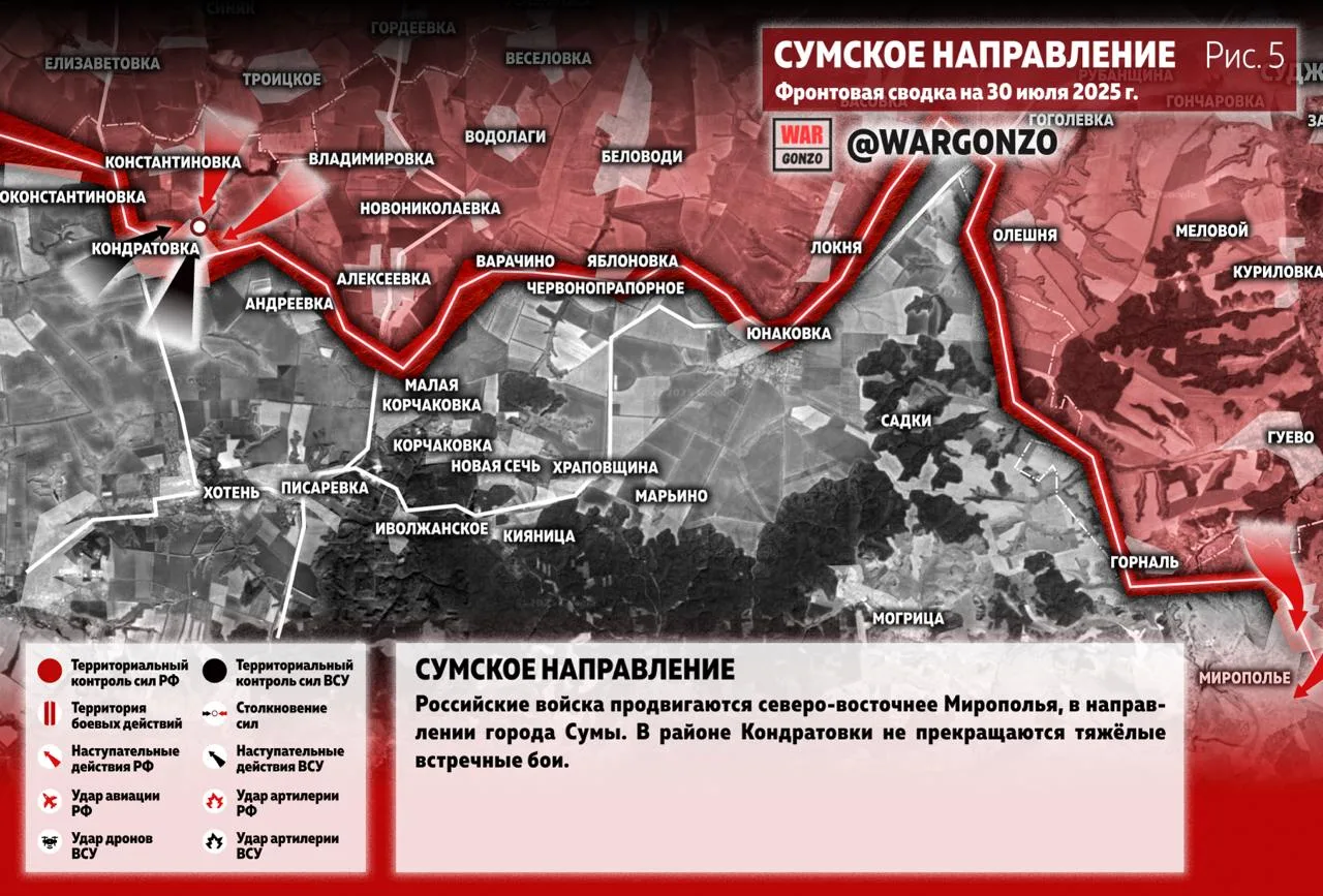 Сумское направление. Российские войска продвигаются северо-восточнее Мирополья, в направлении города Сумы. В районе Кондратовки не прекращаются тяжёлые встречные бои. (Рис.5)