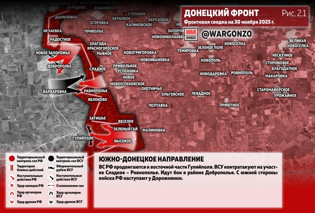 На Покровском направлении продолжаются бои за Гришино. В Покровске ВС РФ продвигаются в районе Динас и в восточной части города, в Мирнограде наступают в микрорайонах Восточный и Западный. Сообщается, что на Добропольском участке войска РФ заблокировали Софиевку с севера, подразделения противника отрезаны от снабжения. (Рис. 2.2)