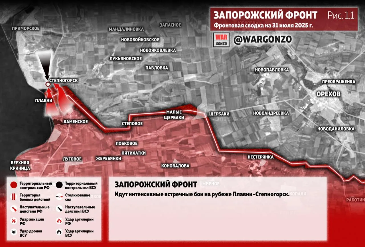 Запорожский фронт. Идут интенсивные встречные бои на рубеже Плавни–Степногорск. Армия РФ продолжает атаковать противника в районе Малой Токмачки. (Рис. 1)