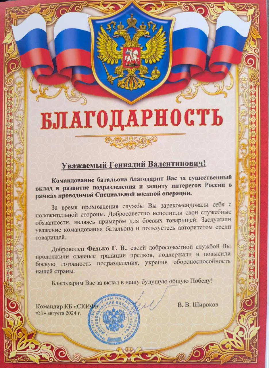 При пересечении границы на пункте Изварино Геннадий был задержан миграционной службой, доставлен в СИЗО и сейчас решается вопрос о его выдворении на родину, где добровольцу грозит срок до 20 лет заключения. Отметим, что в Россию он ехал для перезаключения истёкшего контракта с ЧВК «Редут». Сослуживцы Геннадия сейчас находятся в недоумении: их командир прошёл с ними огонь и воду, был не единожды ранен, отмечен по службе, а теперь именно за заслуги перед Россией он лишится свободы.