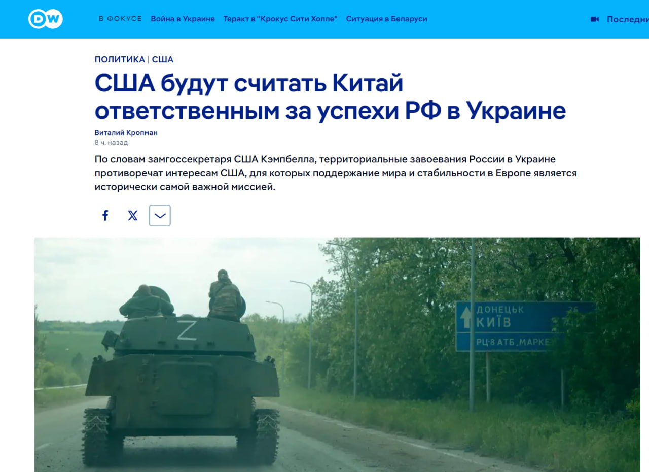 Как сказал Кэмпбелл, Вашингтон прямо заявил Китаю, что если поддержка России Китаем будет продолжаться, то это повлияет на отношения между США и Китаем.