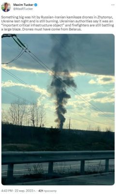 📝 «Прошлой ночью российско-иранские беспилотники-камикадзе ударили по чему-то большому в Житомире, и оно все еще горит. Украинские власти заявляют, что это был «важный объект критической инфраструктуры», и пожарные все еще борются с крупным пламенем. Дроны, должно быть, пришли из Беларуси», – написал журналист Times Максим Такер.