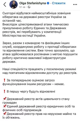 Работа ключевых систем Минюста временно приостановлена. По информации Стефанишиной, в первую очередь будут восстановлены: