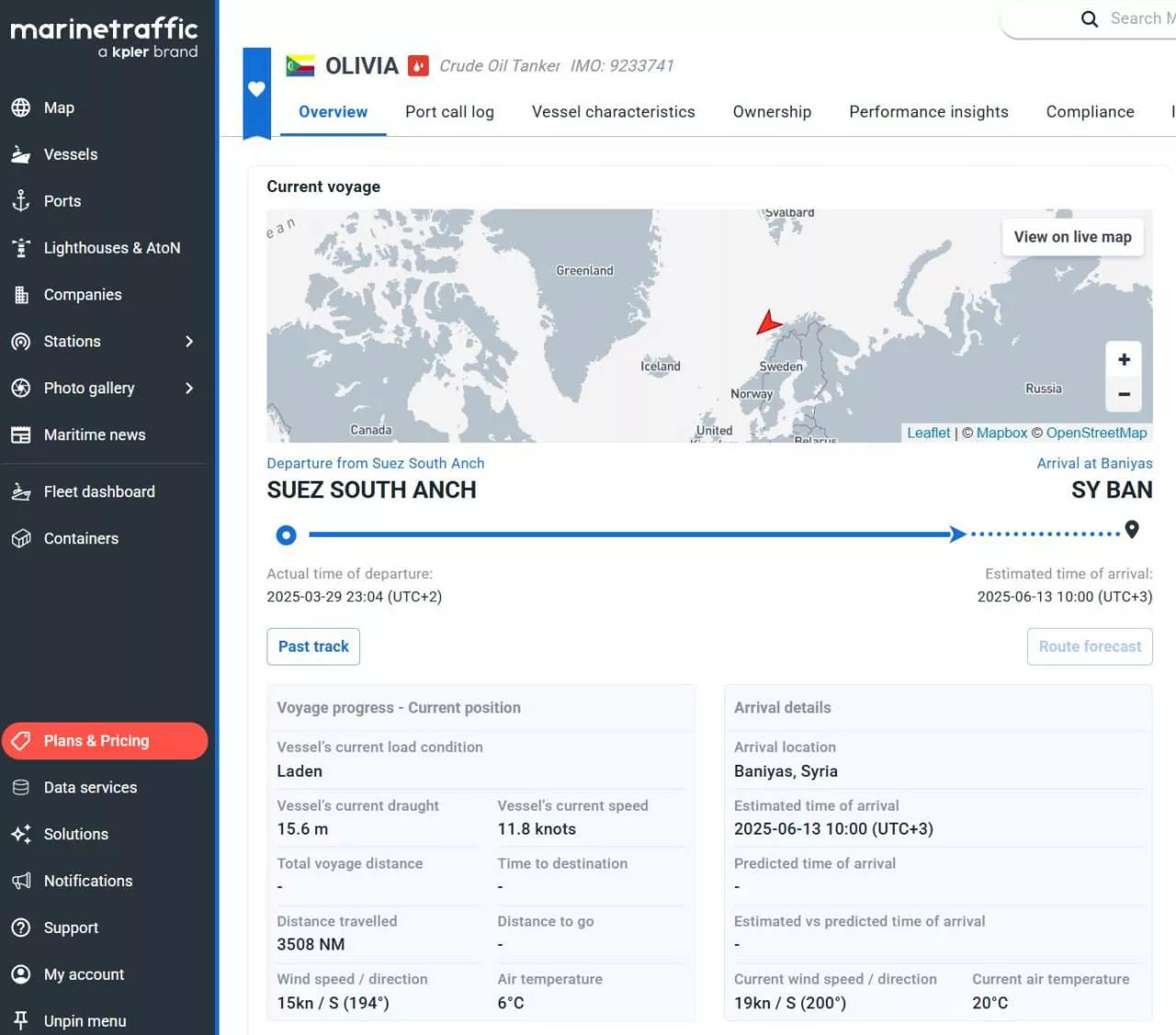 Сегодня мы видим, что танкер Suezmax OLIVIA (9233741) направляется в Банияс, Сирия, с российской сырой нефтью.