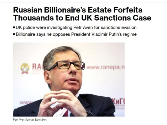 По данным агентства Bloomberg, управляющий имуществом Авена согласился выплатить $963 тыс, чтобы прекратить расследование британской полиции, которое длится два года. Британское Национальное агентство по борьбе с преступностью (NCA) пришло к выводу, что ельцинский министр внешнеэкономических связей РФ использовал счета, принадлежащие его жене и фирмам по управлению недвижимостью, в качестве личной «копилки» для личного финансирования.