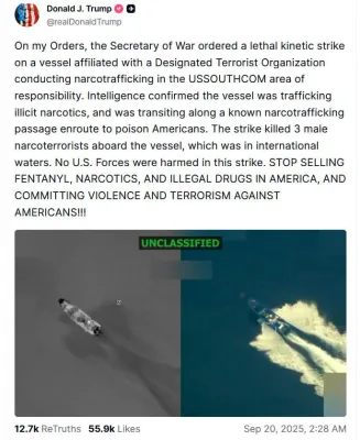 - В Каракасе такие действия сочли угрозой национальной безопасности. Президент Николас Мадуро направил письмо Трампу, предложив начать прямые переговоры через спецпосланника. Он отверг обвинения США в «наркотрафике» , подчеркнув, что через Венесуэлу проходит не более 5% колумбийских наркотиков, и большинство из них власти страны сами перехватывают и уничтожают.