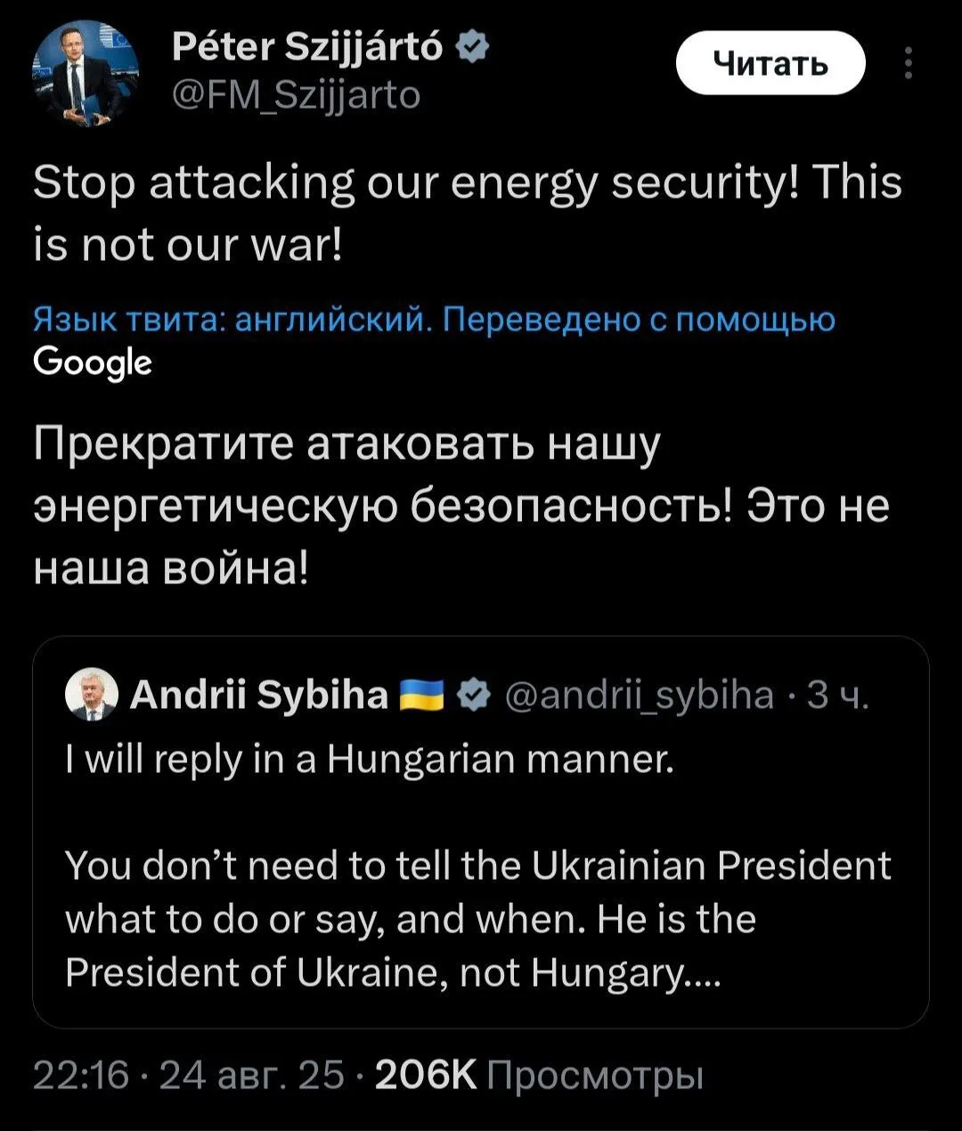 «Не нужно указывать президенту Украины, что и когда делать. Энергетическая безопасность Венгрии в ваших руках. Станьте независимыми от России, как и вся Европа».