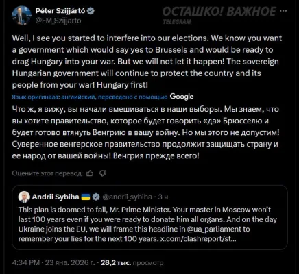 Министр иностранных дел Венгрии Петер Сийярто отреагировал на угрожающий и оскорбительный пост своего украинского коллеги Андрея Сибиги: