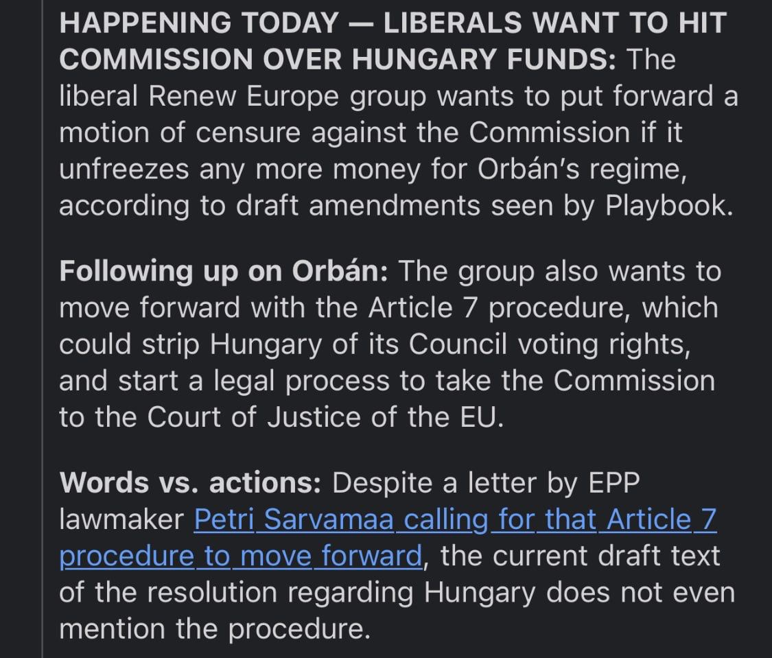 Вероятно, поиск пути финансирования Украины в обход Венгрии зашел в тупик и взятку предложение в 8 млрд для Венгрии оказалось недостаточным. Учитывая слова Орбана, можно сделать вывод, что ЕС легко прогнуть, если давить со стороны фанатов Бандеры (началось с OTP банка, а закончилось разморозкой 30 млрд.).