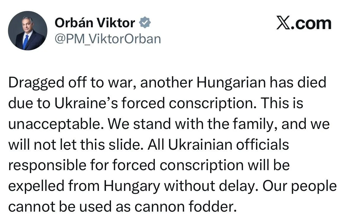 «Ещё один венгр погиб из-за насильственного призыва. Это недопустимо. Наш народ не пушечное мясо», — написал он в X.