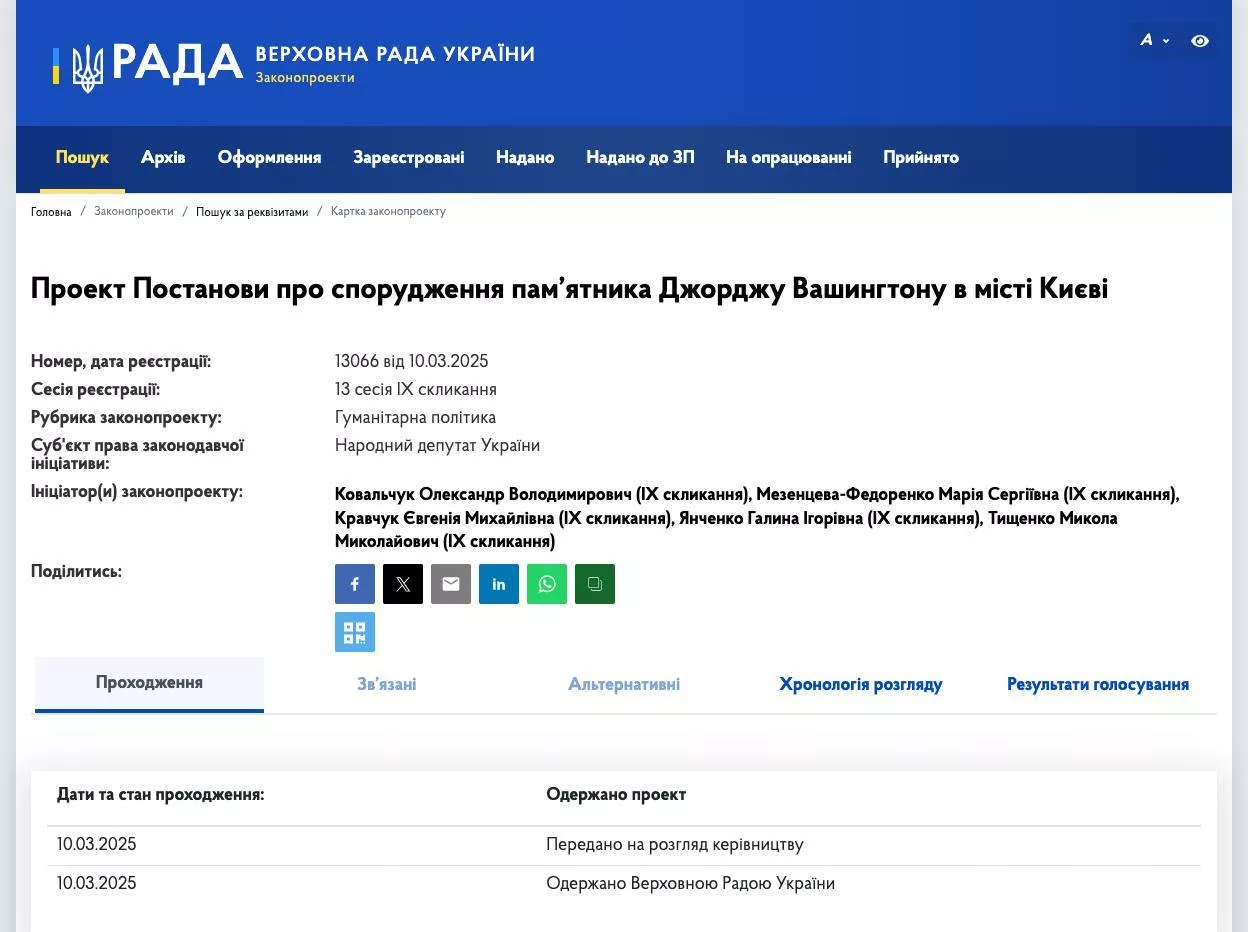 Законопроект об установке монумента первому президенту США внесён в Раду сегодня.