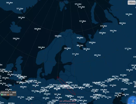 Несмотря на то, что на территории РФ Starlink вроде как не работает, над Мурманской областью проходит одна из наиболее активных космических трасс. Прямо сейчас на высоте в 580 км над регионом летает около 10 спутников.