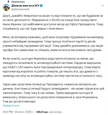 «Друзья, давайте собираться на акцию и отстаивать то, что мы строили в последнее десятилетие. Собираемся в 20:00 на площади у театра имени Ивана Франко. Это ближайшее место к Офису президента», — написал Дмитрий Козятинский в Х.