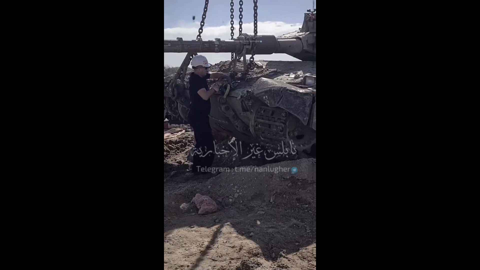 Для подъема танка, получившего тяжелые повреждения, используется массивный кран.