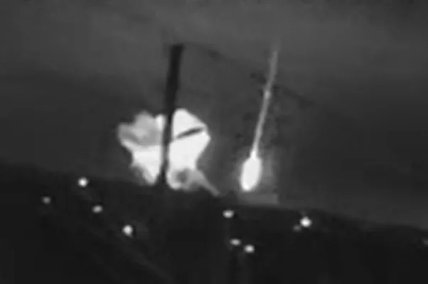 Отчетливо видна пара вертикальных прилетов баллистических ракет, вынырнувших из-за низких облаков.