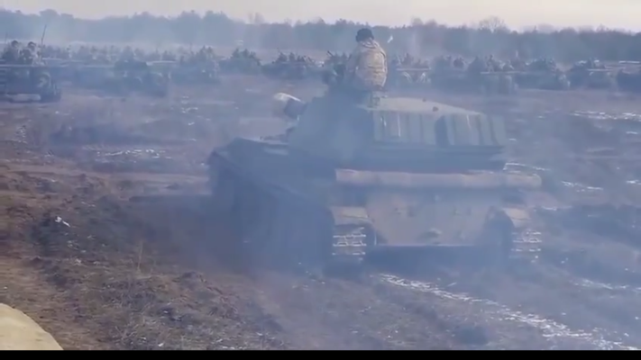 На кадрах видны десятки единиц разнообразной техники, преимущественно советского производства: танки Т-80БВ, БМП-2, БРДМ-2 и машины на их базе, МТ-ЛБ, а также 152-мм САУ 2С3 «Акация» и РСЗО «Град» с машинами управления огнём артиллерии и машинами снабжения.