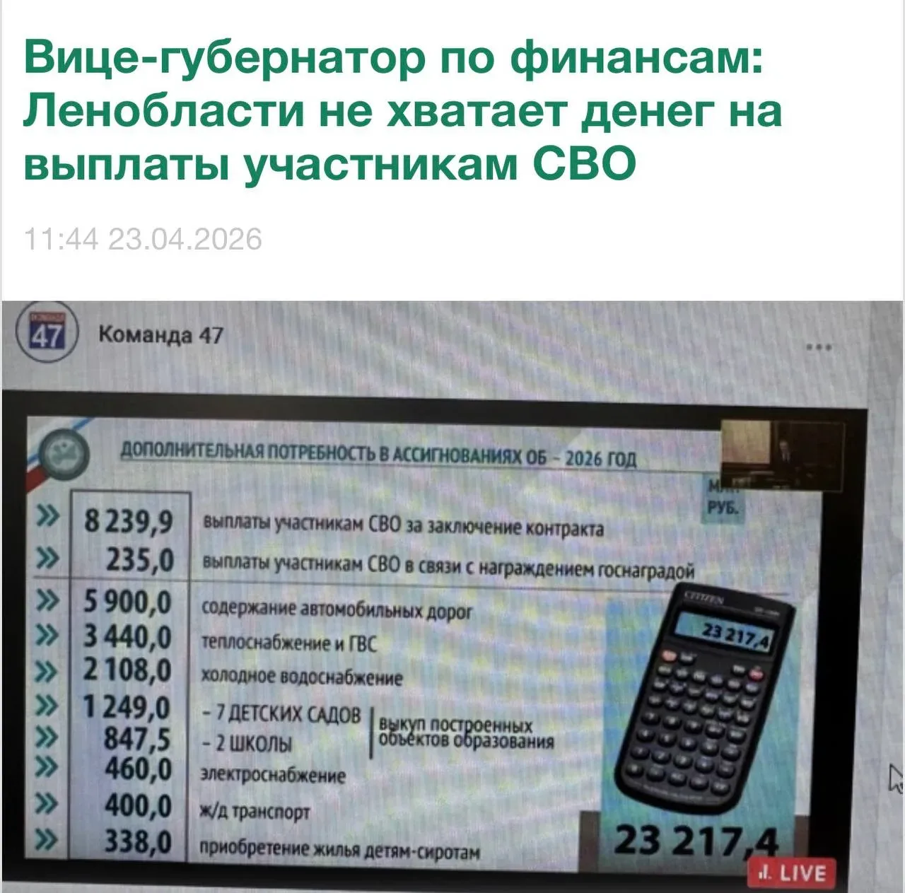 В представленной им таблице говорится, что сейчас бюджету Ленобласти не хватает 8,2 млрд рублей на выплаты участникам СВО за заключение контракта, 235 млн рублей – на выплаты участникам СВО в связи с награждением госнаградой.