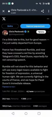 «Я только что благополучно покинул Европу. Франция угрожала Rumble, и теперь они перешли красную черту, арестовав Павла Дурова, как сообщается, за то, что он не ограничивал свободу слова. Rumble не потерпит такого поведения».