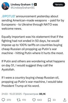 Если бы я был страной, покупающей дешёвую российскую нефть и поддерживающей Путина, я бы воспринял слова президента Трампа всерьёз», – написал Грэм в Х.