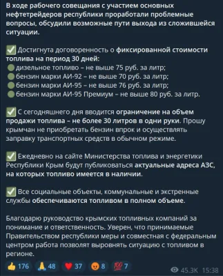 «С сегодняшнего дня вводится ограничение <…> — не более 30 литров в одни руки. Прошу крымчан не приобретать бензин впрок и осуществлять заправку транспортных средств в обычном режиме».
