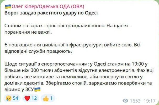 «Есть повреждение гражданской инфраструктуры, выбиты стекла. Все соответствующие службы работают», – заявил глава Одесской ОВА Олег Кипер.