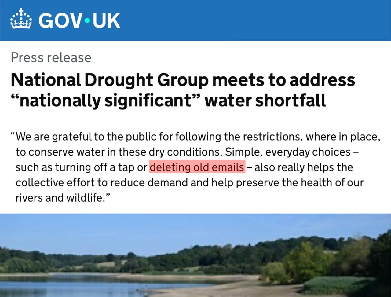 Британия просит граждан удалить старые фото и имэйлы , чтобы «сэкономить воду» — объяснение официальное: дата-центры тратят воду на охлаждение серверов, а меньше данных → меньше охлаждения. Авторы идеи считают, что чистка снизит нагрузку на дата-центры и уменьшит количество воды, необходимой для охлаждения серверов.